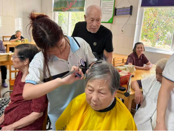 面对不同长辈的需求,学子们展现出在校练就的专业素养:为喜欢利落短发的爷爷调整发长,给爱整洁的奶奶修剪刘海,对行动不便的老人则轻声沟通、缓慢操作,确保过程舒适。曾经在课堂上反复练习的 “分层剪”“轮廓修饰” 等技巧,此刻成了服务长辈的 “暖心利器”,每一款修剪好的发型,都透着细致与用心。